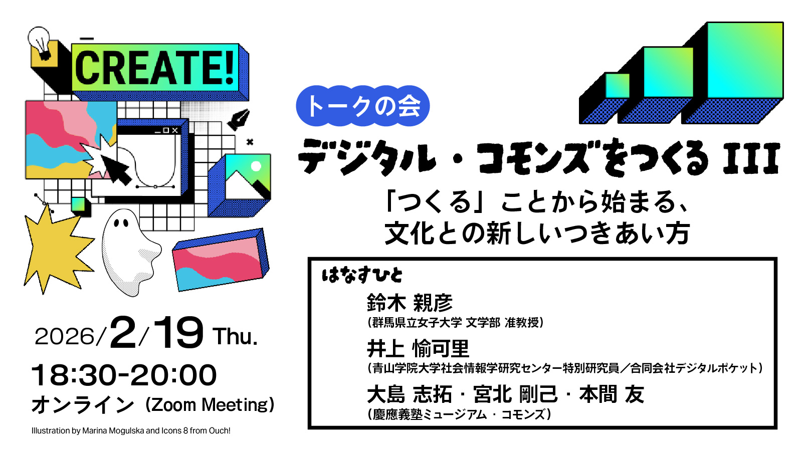 なぜ、デジタル・アーカイヴを「見る」だけでなく「つくる」必要があるのでしょうか? それは、自分たちの手で素材を選び、組み合わせ、形にするプロセスを経ることで、文化との新しい付き合い方が始まるからかもしれません。KeMCoメンバーによるこれまでの実践報告を交えつつ、ゲストと共にデジタル・コモンズのこれからの可能性について語り合います。